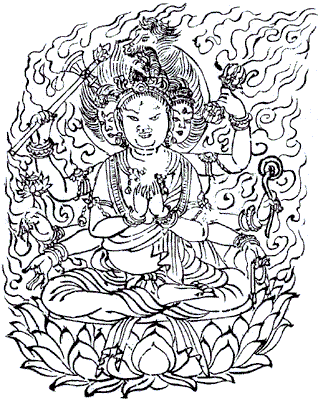 馬頭明王(菩薩)梵名何耶揭梨婆Hayagriva,胎藏界觀音院之一尊,六觀音之一。以配止觀所說六觀音之師子無畏觀音,為畜生道之教主,是無量壽之忿怒身,以觀音為自性身,以馬置於頭,故曰馬頭觀音,亦曰馬頭大士。為大忿怒威猛摧伏之形,故稱為馬頭明王。乃五部明王中蓮華部之明王也。戴馬者,如轉輪聖王之寶馬馳驅四方而威伏之,表跋涉生死大海摧伏四魔之大威勢力大精進力也。又噉食無明重障之意。大日經疏五曰:「何耶羯梨婆,譯云馬頭。其非黃非赤,如日初出之色。以白蓮華為瓔珞等,莊嚴其身。光焰猛盛,赫奕如鬘。指甲長利,雙牙上出。首鬘如師子頂毛,作極吼怒之狀。此是蓮華部忿怒持明王也。猶如轉輪王寶馬巡歷四洲,於一時一切處去心不息。諸菩薩大精進力,亦復如是。所以得如是威猛之勢,於生死重障中不顧身命,多所摧伏者,正為白淨大悲心故。故以白蓮瓔珞而自嚴身也。」大日經義釋七曰:「蓮華部眷屬以馬頭為忿怒明王。」義軌曰:「馬頭明王,賀野紇里[口*縛],噉食無明諸障盡也。」秘藏記末曰:「馬頭,無量壽忿怒,自性輪觀音。」又曰:「馬頭觀音菩薩,赤肉色,大忿怒之相,并三面,牙在唇上,頭有白馬之形如輪王寶馬。」經軌有訶耶揭唎婆觀世音菩薩法印咒品(出陀羅尼集經第七),何耶揭唎婆像法,何耶揭唎婆觀世音菩薩受法壇,各一卷。 |