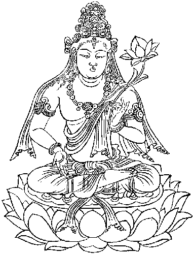水吉祥菩薩(菩薩)亦稱水月觀音菩薩,,譯之為水吉祥。又其密號稱為「潤生金剛」,由於以瓶水注入一切眾生的心田之乾地從事慈濟為其本誓,故而名之。這與世上所謂在水中觀月的觀音,是有所不同的。因此「大疏」中說:「水吉祥或許從蓮華中擠出些水 ,垂下手來擠出水」。此菩薩住於胎藏界曼荼羅觀音院的第三行第五位,其法相在「祕藏記」中說:「身黃色而左手執蓮花,左 邊有燒香供養使者,右邊有塗香供養使者」,右手作成與願。又在「薄草訣」中,則解說三面六臂之像,談到 「左第一手持寶蓮華,次一手持金輪,第三手持孔雀之尾,右第一手持利劍,次一手持寶珠,第三手持青蓮華。其身色如日光,住於寶山上。其他的異說甚多,法相亦甚多。印相則作外縛,將二中指併立對合,作成月輪狀。