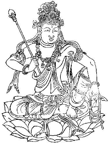 一位,至於其法相,異說頗多,「祕藏記」中記戴:「白肉色而左手取罥索,右手執開敷蓮華」。「覺禪鈔」則揭出右手持如意寶珠的像。胎藏界的像,則是左手持索,右手持技。印相則左手作胎拳,作如持索狀,右手則作施願狀。